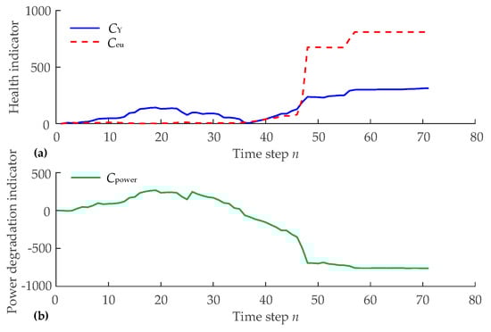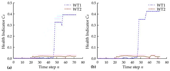 Effect of sampling frequency on the health indicators of the wind turbine: (a) sampling frequency is 0.2 Hz, total time step n = 73; (b) sampling frequency is 0.1 Hz, total time step n = 73.