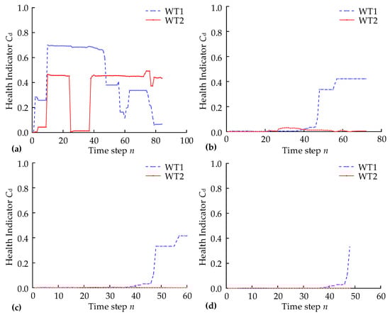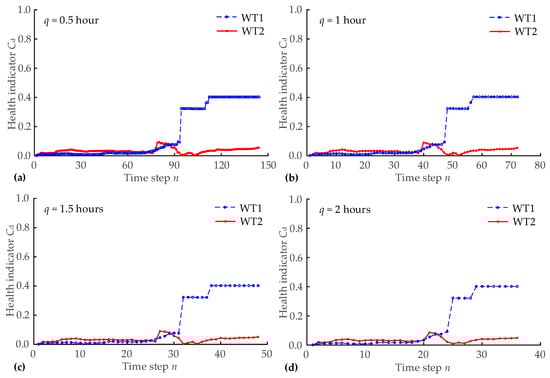 Effect of time increment on the health indicators of the wind turbine: (a) q = 0.5 h, total time step n = 145; (b) q = 1 h, total time step n = 73; (c) q = 1.5 h, total time step n = 49; (d) q = 2 h, total time step n = 37.