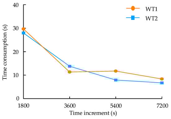 The time increment in the sliding window model reflects the frequency of data measurement within the window. The selected window width h = 24 h, and the time increment q was 0.5 h, 1 h, 1.5 h, and 2 h. The time consumption of the calculation of the health indicators for the two wind turbine sets at different time increments is shown in Figure 11.