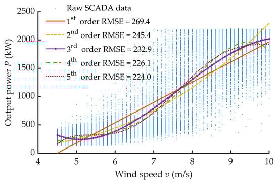 SCADA data describe wind turbine performance, and modeling via data fitting is used to describe the operation of a wind turbine. Polynomials are typically used to describe unknown functional relationships. Generally, the higher the order is, the more accurate the description is. Under certain conditions, an increase in order will not significantly improve the accuracy. In this paper, first- through fifth-order polynomials were used to fit the wind speed and power data. The results of these analyses are shown in Figure 13.