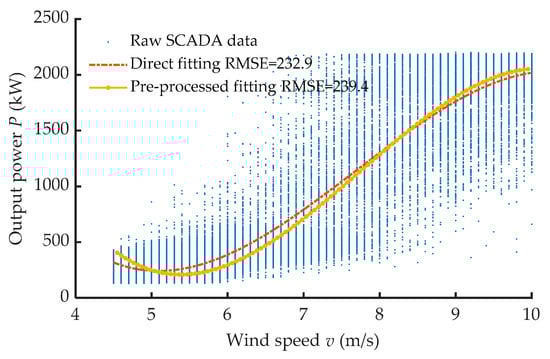 Fitting between the wind speed and output power was used again as an example. Raw data were substituted into Equation (8) for fitting; the resulting fit was then compared with that produced after pre-processing. The results of these analyses are shown in Figure 14. The root mean squared error was calculated over the whole raw data, and the calculated result of the direct fitting method equaled 232.9, while that after pretreatment equaled 239.4; thus, direct fitting performed better than refitting after pretreatment. When the basic characteristics of data relations are mastered through physical and mechanical analysis, the bin method’s pretreatment is not needed, and the raw data can be used directly for model fitting.