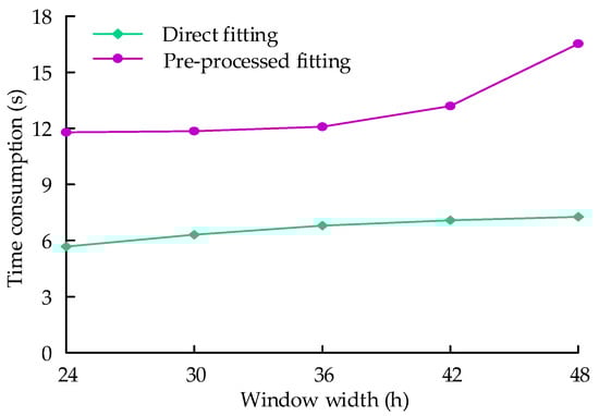 The discussion of this problem involves SCADA system configuration. The better the system configuration is, the shorter the time required for the same calculation workload is. The calculation workload required for health index identification is also critical. For example, considering more relationships between wind turbine operating parameter data requires a higher computation workload and thus longer computation times for the same system configuration. Consider the following large wind turbine SCADA system configuration as an example: Intel i7-4790 CPU, 16 GB of operating memory, 1 TB hard disk, Windows 7 operating system. The system was used for modeling the relationship between wind speed data of WT1 and power data of WT1 in a window width by data fitting to analyze the time consumption of the data fitting calculation statistically. The width of the data window was set equal to 24, 30, 36, 42, and 48 h. The direct fitting method was used and then compared to the preprocessing and refitting method proposed in []. The modeling time is shown in Figure 15. The computation duration was shown to increase as the data window width increased, particularly when using the preprocessing and refitting method proposed in []. When the window width was 24 h, the computation duration of the direct fitting method was 5.67 s, and that of the preprocessing and fitting method was 11.79 s, which means that the computation duration time of the method proposed in [] was approximately twice as long as that of the direct fitting method.
