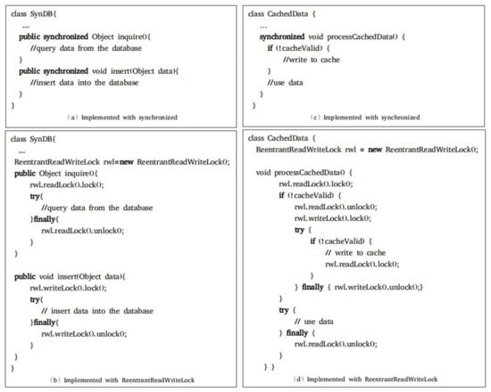 Figure 1 presents the use of two different lock structures to implement the insert and inquire operations on the database. The program of Figure 1a is implemented by synchronized, where inquire() is a query operation for the database and insert() is an insert operation. The program in Figure 1b is implemented by ReentrantReadWriteLocks, where the query operation inquire() is a read operation, so the read lock is used. The insertion operation insert() is a write operation, so the write lock is used. Note that when using ReentrantReadWriteLocks for synchronization, the unlock() command must be called to release the read lock or the write lock after the operation that requires synchronization. A try-finally construct is usually used when the ReentrantReadWriteLock is used, and the operation of releasing the lock is placed in the final block to ensure that the lock is always released to avoid deadlocks.
