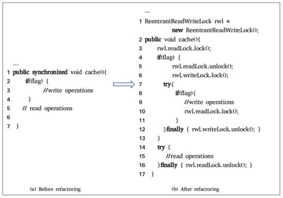 Figure 4b presents the program after refactoring. Under the control of a read lock, a conditional statement flag is read (Line 4). If the condition is met, write operations are executed. Therefore, the current thread will release the read lock (Line 5) and acquire the write lock (Line 6) to perform the write operations. Note that a thread needs to release the read lock before getting the write lock. After acquiring the write lock, the conditional state will be rechecked (Line 7) in case other threads acquire the write lock and modify the state.
