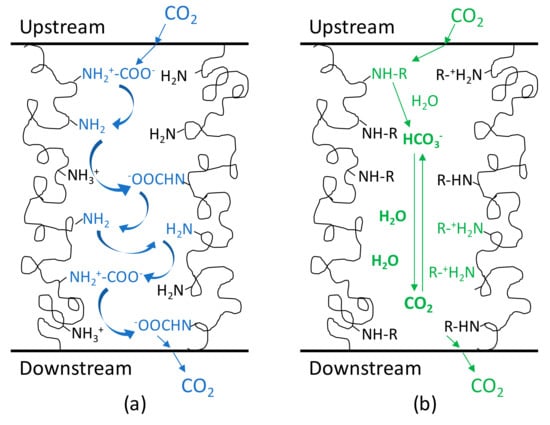 In both schemes, the reaction starts at the upstream side of the film, which represents the complexing of CO2 to the carrier molecule once the gas is dissolved. The opposite reaction will take place at the downstream side, leading to the decomplexation of the carbon dioxide and allowing the molecule to pass once again into the gaseous phase.