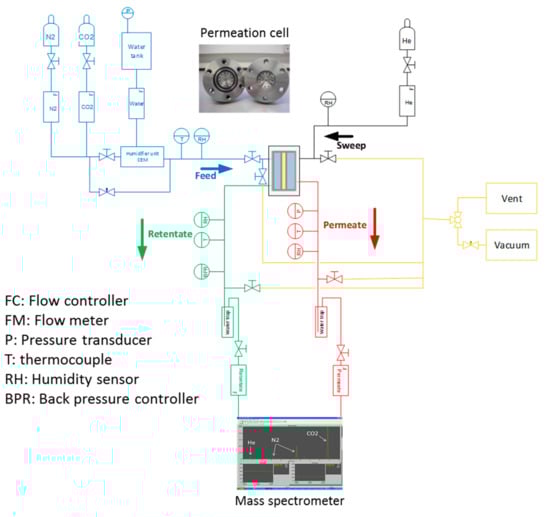 Gas permeability measurements were performed with a mixed gas–continuous flow permeation cell designed in our laboratory (Figure 2). Pure gases (CO2 or N2) (120 Ncc/min) were fed to the system with mass flow controllers (Bronkhorst Company, Ruurlo, The Netherlands). The stream was humidified (RH = 75% and 95%) using a controlled evaporating and mixing system (Bronkhorst Control Evaporator Mixer W-202A-221-K). The total pressure of the humid feed and retentate streams were controlled by a back pressure controller (Bronkhorst Company, Ruurlo, The Netherlands) and the permeate stream was collected using a helium sweep gas with a controlled flow rate (10 Ncc/min, Bronkhorst Company, Ruurlo, The Netherlands). The permeation cell was placed in a heating cabinet (Carbolite PF030-230SN) in order to maintain a constant temperature (40 °C). All the tubing was heated with heater ropes in order to avoid any condensation in the rig.