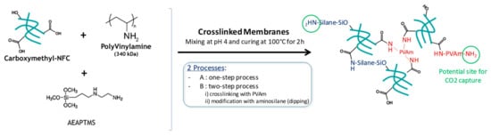 In this report, we combined cmNFC raw material and an amine-based polymer to improve the compatibility between the nanofillers and the PVAm matrix by crosslinking with the use of amine-based fixed carriers to enhance the CO2 permeability performance. Indeed, carboxylic acid functions of the cmNFC nanofillers can react with primary amine functions of the PVAm matrix to create a new covalent bond between the filler and the matrix by amidation []. AEAPTMS were also grafted onto cmNFC surface to enhance the compatibility between the filler and the matrix and to add new potential site for CO2 capture. Such membranes were elaborated according the following strategy (Figure 3). The elaboration of the membranes was performed either in a one-step process (process A) or in a two-step process (process B). In process A, all components were mixed together in one pot, whereas in process B, the crosslinking between the nanofillers and the matrix was first carried out and then the grafting of the aminosilane was performed by dipping the crosslinked membranes inside the aminosilane solution. Process A could provide different type of crosslinking reactions. Indeed, the aminosilanes can react either with their amine end-chain groups (towards -COOH groups) or their siloxanes (towards -OH groups) inducing a second network but reducing the amount of potential free -NH2 site for CO2 capture. Process B was more controlled; all the carboxylic acid functions of the cmNFC nanofiller should first react with the pendant amine functions of the PVAm matrix and then the aminosilanes should only be grafting onto -OH groups by dipping for 5 min and curing for 2 h at 100 °C []. The approach of crosslinking chosen consisted in first creating ionic bonds between deprotonated -COO- groups of the cmNFC and the protonated NH3+ at pH 4 and then forming the covalent bond by a heat-induced step at 100 °C for 2 h [].