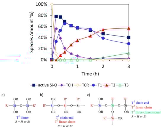Hydrolysis-condensation kinetics curves of AEAPTMS in acidic D2O/EtOH (20/80) medium followed by liquid 29Si NMR in-situ. Chemical structures and assignments of the different species obtained: dimers (a), linear oligomers (b), and three-dimensional species (c).