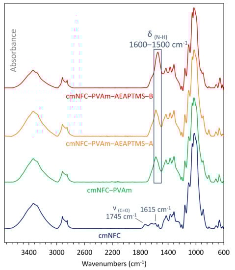 FTIR spectra of cmNFC, cmNFC-PVAm, and cmNFC-PVAm-AEAPTMS-A and -B membranes.