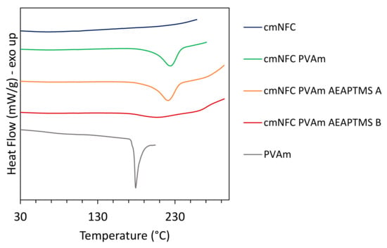 DSC curves of cmNFC, cmNFC-PVAm, and cmNFC-PVAm-AEAPTMS-A and -B membranes.