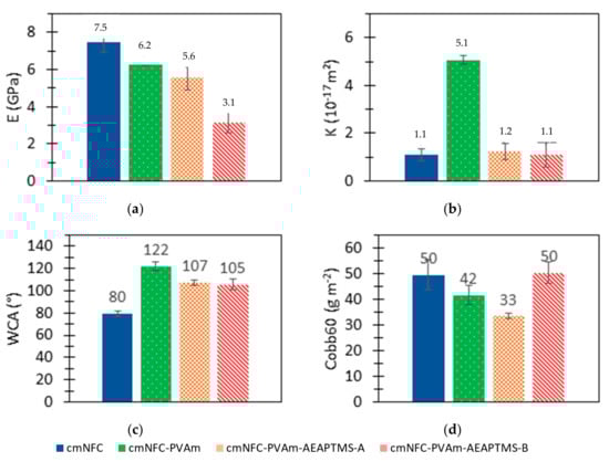Properties of cmNFC, cmNFC-PVAm, cmNFC-PVAm-AEAPTMS-A and -B membranes: Young’s modulus (a), intrinsic air permeability (b), water contact angle (c), and Cobb60 measurements (d).
