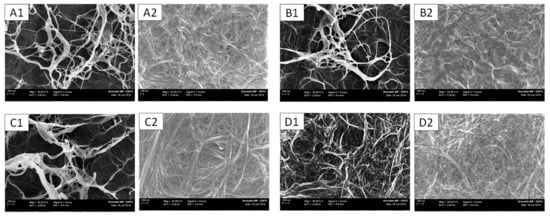 FEG-SEM pictures of cmNFC (Ai), cmNFC-PVAm (Bi), cmNFC-PVAm-AEAPTMS-A (Ci), and cmNFC-PVAm-AEAPTMS-B (Di) on individual fibers (i = 1) and surface (i = 2) [x30,000].