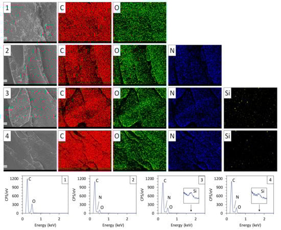 FEG-SEM pictures with EDX mapping on Carbon, Oxygen, Nitrogen and Silicon elements of cmNFC (1), cmNFC-PVAm (2), and cmNFC-PVAm-AEAPTMS-A (3) and -B (4) surfaces. Spectra of the intensity of X-radiation emitted by the sample under an electron beam were also presented in function of the energy on the delimited area of the membranes with the assignment of the energy of the different elements.