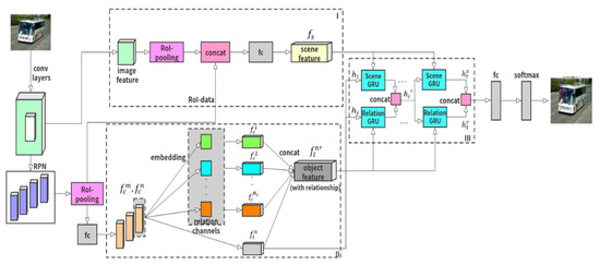 where represents the information obtained by the scene GRU, and denotes the information obtained by the relation GRU. The integrated information will be sent into the next GRUs as the new initial state.