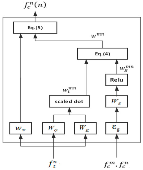 where the relationship weight represents the impact of the mth object to the nth object, softmax is employed for normalization. Finally, Equation (5) can be utilized to get a feature that has the influence of surrounding objects on it.