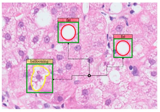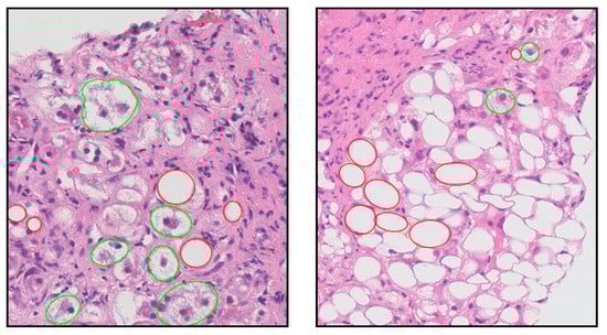 Representation of tissue alterations indicating NAFLD disease using a manual counting process. Ballooned hepatocytes are marked with a green contour line, while the areas of fat accumulation with a red one. This process is time-consuming and highly subjective among physicians, demonstrating the need for a fully automated recognition tool.