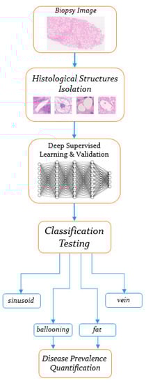 A significant number of research efforts focus on the quantification of liver steatosis. These approaches utilize a combination of image processing techniques (including regions of interest segmentation) with supervised machine learning techniques, using manually annotated features. Τhe risk of hepatic obstruction, which refers to the blockage of the bile ducts, sinusoids, portal veins, etc., has led researchers to develop fat detection systems [6,7,8,9], combined with trained classifiers for the separation of fat tissue from other histological structures [10,11]. Thanks to the effectiveness of these diagnostic systems, histopathology has focused on more complex identification problems, including hepatocellular ballooning and tissue inflammation. These are two chronic diseases for which no automated diagnostic solutions existed until recently [12]. The field of histopathology needed a new generation of algorithms with more independent approaches to the segmentation and classification problems.