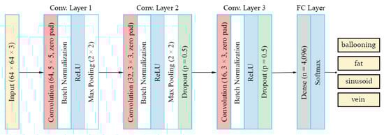 - In the first convolution layer, 64 convolution filters consisting of a 5-by-5 kernel size are defined to detect “low-level” features, such as edges, from the raw image data. In each convolution operation, zero-padding is utilized to assign 0 values around the inputs to maintain an output size equal to the input of each kernel filter [14]. Subsequently, batch normalization is applied to normalize the convolved values, as well as the Rectified Linear Unit (ReLU), being the nonlinear activation function, which is considered ideal for minimizing the vanishing gradient problem [15]. Even though ReLUs are widely used in most deep learning applications, their unboundedness on the positive side tends to cause overfitting. To circumvent this issue, max pooling filtering with a stride of 2 is set to decrease overfitting by reducing the spatial size (width and height) of the data representation [16].