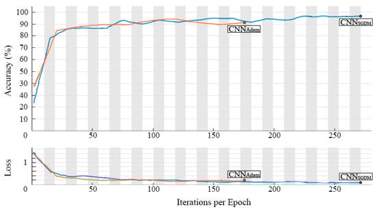 At first, the CNNAdam validation graph (Figure 4) is monitored, which shows the convergence of the neural network’s training process during the 162nd training iteration. This was the result of the combination of overfitting with the production of three similar validation values equal to 91.7%. In contrast, the CNNSGDM graph shows that the SGDM optimizer performed better as it did not overfit the training data. This led to better results, as the deep classifier not only completed the learning process by running in all 30 epochs but also produced a higher validation value of 96.7%.