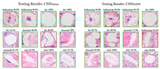 Examples of the image patch test results are shown in Figure 5. Each of these images is accompanied by its estimated classification probability (%), indicating how confident the CNNs are of their predictions. According to the figure, in most cases, an accurate discrimination result marked by a green frame is presented for the four hepatic tissue objects. It is observed that both neural networks have a reduced efficiency in identifying some sinusoids (red frames = misclassifications), which are among the most complex histological features to classify. However, the success lies in the fact that all ballooned cells and fat droplets, which characterize two of the most widespread liver diseases, have been identified with high confidence levels. Based on the exported percentages in Table 1, it is clear that the classifiers are more stable in detecting ballooned hepatocytes, as these consist of multiple changes in the values of their adjacent pixels. They also successfully achieve a visual discrimination of circular structures not always referred to as steatotic fat cells, but as hepatic veins, because they tend to contain several red blood cells.