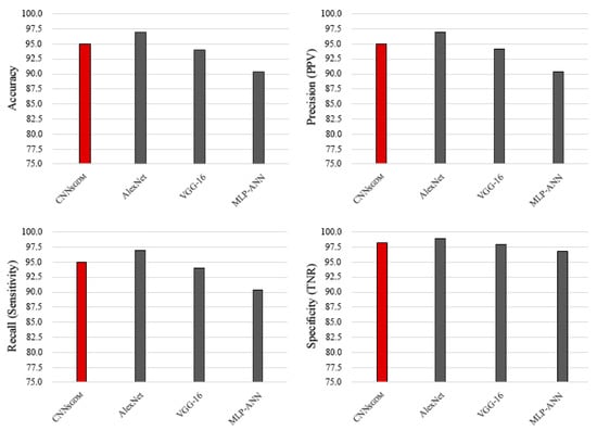 In both classifiers, the training process was set for a maximum of 10 epochs, while the SGDM algorithm was used to optimize the training process. The validation patience number was set again equal to 3, with the networks completing their training in less than 10 epochs. According to Table 2, a comparison of the accuracy, precision (positive predictive value—PPV), recall (sensitivity) and specificity (true negative rate—TNR) rates, generated by the AlexNet, VGG-16 and the previously built CNNSGDM architecture, is done. According to the percentages in Table 2, the constructed CNNSGDM architecture achieves better classification performances (accuracy: 95%, precision: 95%, recall: 95%, specificity: 98.3%) than VGG-16 (accuracy: 94%, precision: 94.1%, recall: 94%, specificity: 98%), while AlexNet emerges as the most optimal classifier (accuracy: 97%, precision: 97%, recall: 97%, specificity: 99%). All performance differences are presented in Figure 6.