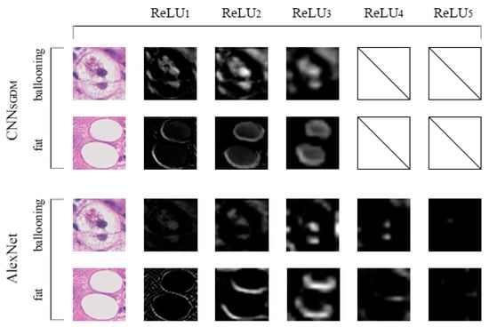 As shown in Figure 7, it is found that in the two CNNs, the interest in the first ReLU1 activations lies at identified edges, which can synthesize the basic structure of the balloon cell and fat droplet. It is recalled that both the CNNSGDM and AlexNet models apply the max pooling operation to their convolution layers (CNNSGDM: layers 1, 2, AlexNet: layers 1, 2, 5). Unlike CNNSGDM, AlexNet applies a 3 × 3 max pooling in all cases, which causes more blur in the two liver samples as it aims to reduce overfitting of the convolved pixel data. Based on the ReLU2 activations, this technique is demonstrated to be efficient as it forces both neural networks to filter “higher-level” features that are less co-adapted and can lead to better generalization. Also in ReLU2, it turns out that CNNSGDM executes an earlier activation of pixels that indicate swollen hepatocytes, while AlexNet chooses to perform additional filtering on the detected edges. Moving onto ReLU3 activations, it is noted that non-informative pixel activations have been significantly reduced in both deep models, with AlexNet performing a more ideal filtering of the necessary curves that form the perimeter of the ballooned hepatocyte and the lipid droplet. The same model achieves also better performance within the ballooning area, as only the most important pixels of the two hepatocytes are activated.