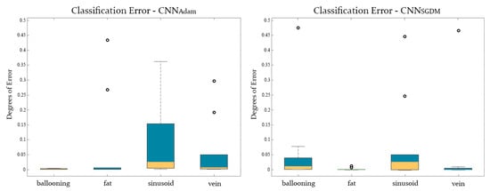 The boxplot has become an ideal technique for presenting a 5-number summary (minimum and maximum range values, upper and lower quartiles, and median value), offering a quick analysis of the models’ classification performance [28]. Both CNNAdam and CNNSGDM neural networks show a comparatively longer inter-quartile range (IQR) in the sinusoid class, yielding ultimately higher larger error values, resulting from Q3 + 1.5 * IQR, than the rest hepatic tissue structures. Based on Figure 8, two false positive sinusoid classifications in CNNAdam as liver veins have yielded a greater error variability for the corresponding vein class. The same is true for the CNNSGDM model diagram, where one incorrect classification of a balloon cell as sinusoid (false positive) and another, including a sinusoid misclassified as a ballooning area (false negative), have increased the inter-quartile error range for both class labels. All these performances, along with the error rates, ultimately produce a classification accuracy of up to 95%. It is noted that they show an improvement compared to the results of previous classification approaches [29] and is expected that they will further reduce the overall fat and ballooning prevalence ratio error compared to human visual interpretations [30]. It is also important, that current outcomes suggest a steady improvement in automated detection techniques and emphasize their diagnostic capabilities with respect to semi-quantitative methods.