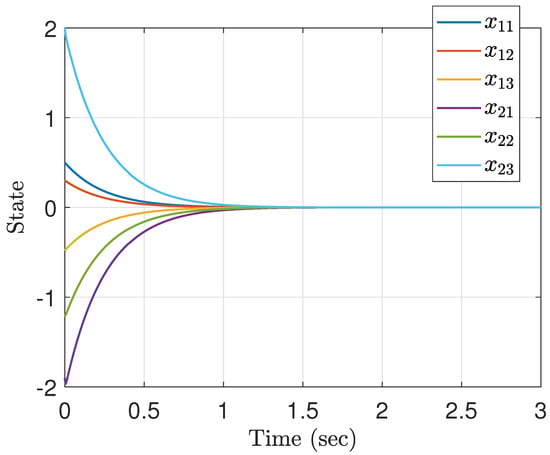 For demonstration, the parameters  and  are selected as  and , respectively. With these settings, the settling-time estimate is  and the associated gain matrices , , and  can be determined accordingly.