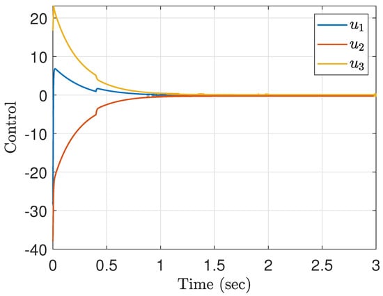 The proposed design approach is now applied to the attitude stabilization problem of a spacecraft. Consider the attitude control model of a spacecraft shown in [,], which has the same form as (1) with . The system states of this model are the three Euler angles  and their derivatives , i.e.,  and . Moreover, the drift term  is time-invariant and  is a constant matrix []; thus,  and  are briefly denoted by  and G, respectively, while having the following form []: