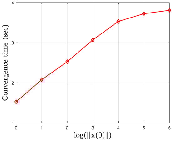 The simulation results shown in Figure 1 and Figure 2 are conducted for the initial state . Clearly, Figure 1 shows that the finite-time stabilization task can be successfully performed by the corresponding control signals shown in Figure 2, where the abrupt changes in the control signals originate from the discontinuity of  at  s. It can be found that the settling-time (convergence time) of state trajectories is much less than  (i.e., the settling-time estimate). This in turn reveals that the fixed-time stabilization can be achieved by the controller designed by Theorem 1. In addition, Figure 3 depicts the convergence times of the simulations conducted with different initial states from which one can observe that the correspondence between the convergence time and initial state, and obtain, moreover, the same conclusion (i.e., the success of the fixed-time stabilization). Notably, this example exhibits the merits and effectiveness of the proposed approach.