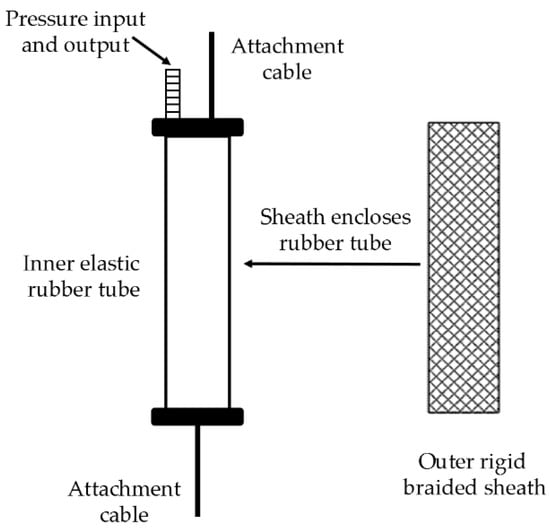 The PAMs are mainly composed of internal rubber and external diamond-like braided fibers, as shown in Figure 1. The outer woven mesh is composed of high-strength fibers. When the rubber tube is inflated, the rubber tube compresses the outer woven mesh due to elastic deformation. Due to the high rigidity of the woven mesh, it can only be radially deformed. The diameter becomes thicker and the length is shortened. Therefore, it is usually possible to adjust the contraction and elongation of the artificial muscle by changing the amount of air pressure in the rubber tube.