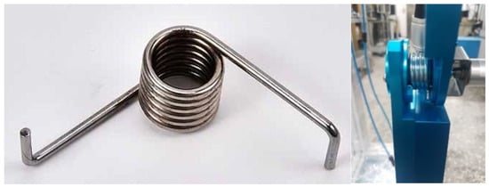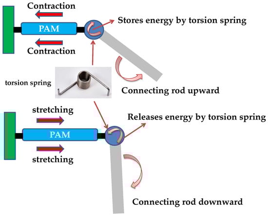 In this study, the spring mechanism is designed to use the torsion spring as the energy absorption of the PAM during elongation to generate the reaction force required for the joint rotation. The physical diagram and mechanism installation diagram are shown in Figure 3. The helical springs of the “Helical Torsion Spring (Product made by Spring Industries Co., Ltd, New Taipei, Taiwan)” are the same as the spiral compression springs or tension springs, however, the spring wire at the ends extends along the tangential direction of the spiral. When the spring is subjected to the torsional load, it will be deformed by the torque generated by the shaft of the spring.
