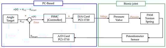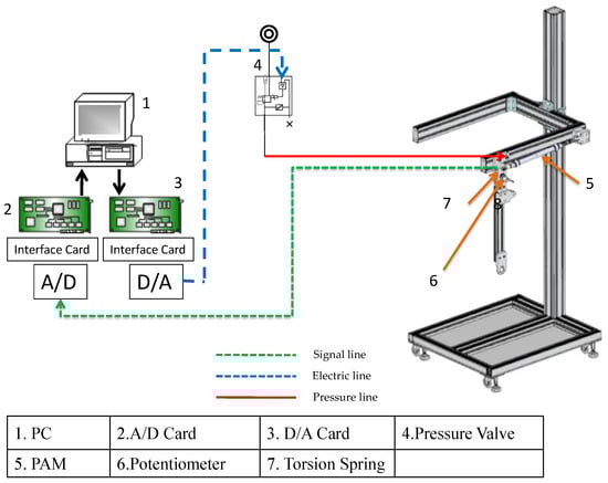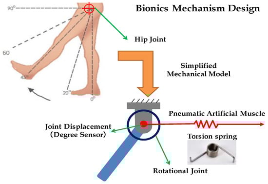 The mechanical design concept of the bionic joint is shown in Figure 4. To simplify the biomechanical model, a single joint is driven by a single-PAM with a torsion spring. The joint angle is measured by a precision potentiometer and controlled by a designed controller to achieve angular control.