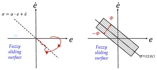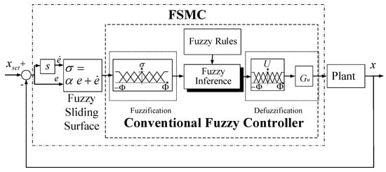 The FSMC consists of two parts, a sliding surface estimator and a fuzzy logic controller [,,]. Subtracting the target value from the feedback output signal produces the error and the error rate , multiplies the error term by the gain , and combines them into a sliding surface as: