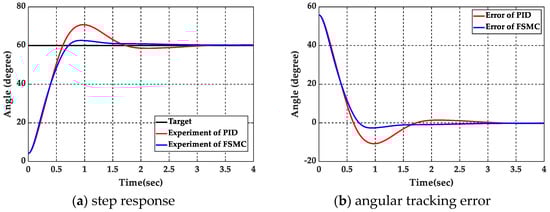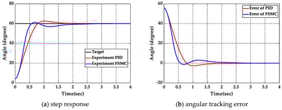 Comparison of experimental results for step input for the 1-DOF robotic lower limb system driven by a single-PAM with a torsion spring without loading between PID (Proportional–Integral–Derivative) controller and FSMC: (a) the step response; (b) the angular tracking error.