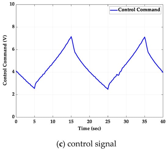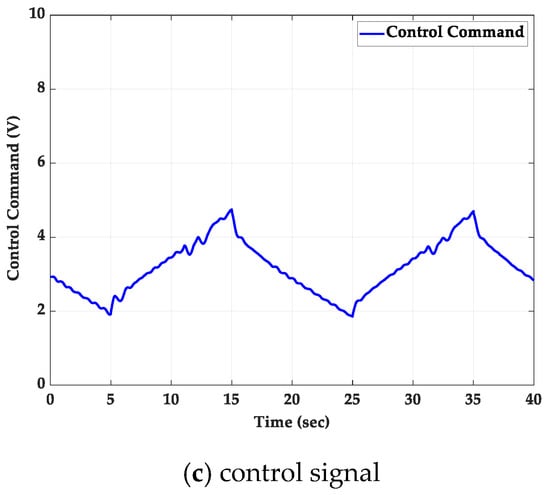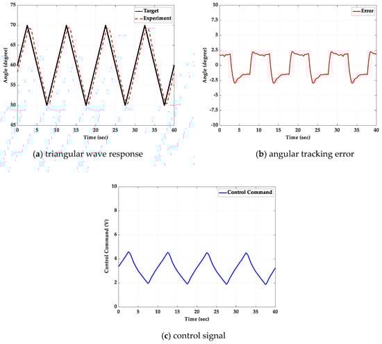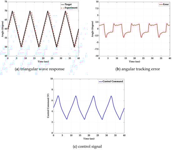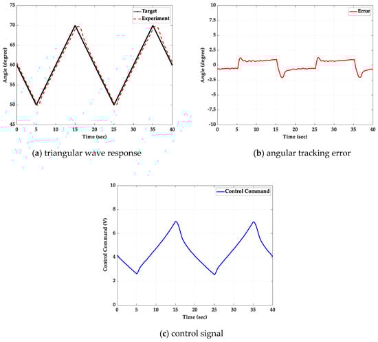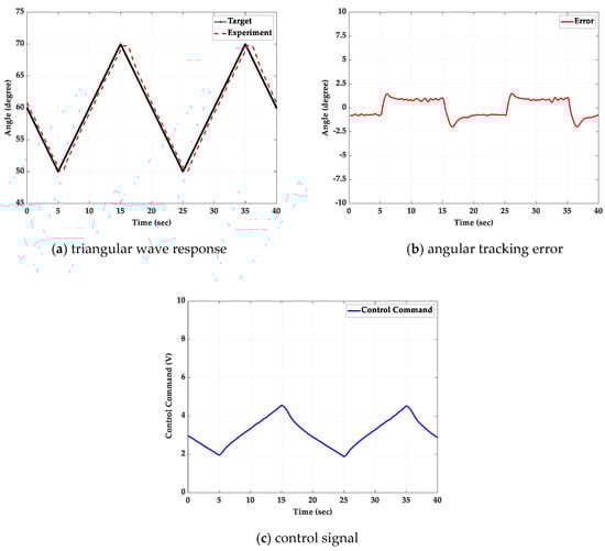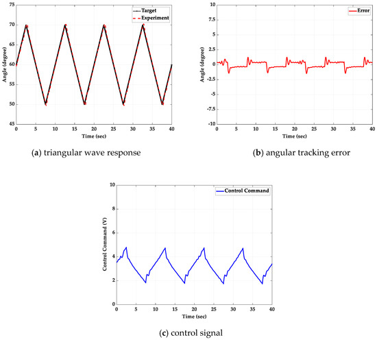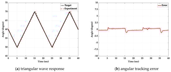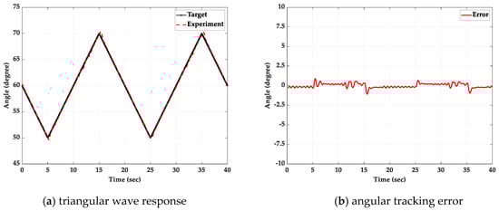 The triangular wave path-tracking control response with periods of 20 s and 10 s for the experiment without additional loading by using the PID controller and FSMC are shown in Figure 14, Figure 15, Figure 16 and Figure 17, including the angular path response, the angular tracking error and control signal.