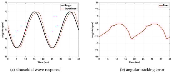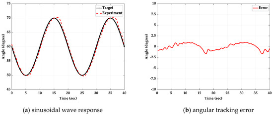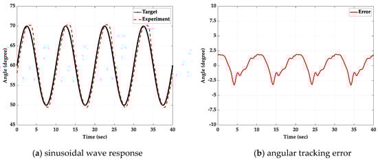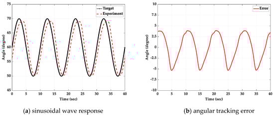 Experimental results for sinusoidal wave path tracking control with frequency in 0.05 Hz for the 1-DOF robotic lower limb system driven by a single-PAM with a torsion spring with a 2 kg loading mass by using the FSMC: (a) the angular path response; (b) the angular tracking error.