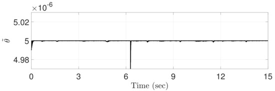 - When , the update parameter increases until . Subsequently, is a time-varying parameter, which is inversely proportional to . This implies that becomes smaller when the sliding variable moves away from the sliding manifold. They exhibit an inverse relationship: when the time-varying parameter is small, the update parameter provides a fast response and will be large consequently. On the other hand, when the sliding variable is in the vicinity of the sliding manifold, a large update parameter may cause undesired side effects, e.g., chattering or fluctuation, owing to excessive control torque. To avoid this problem, in Equation (11) is increased to a point where it will quickly create a region in which the update parameter decreases.