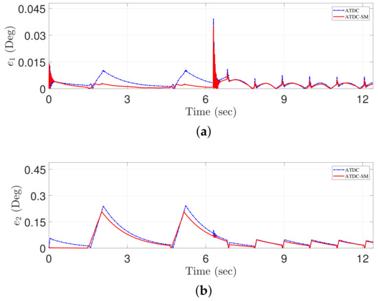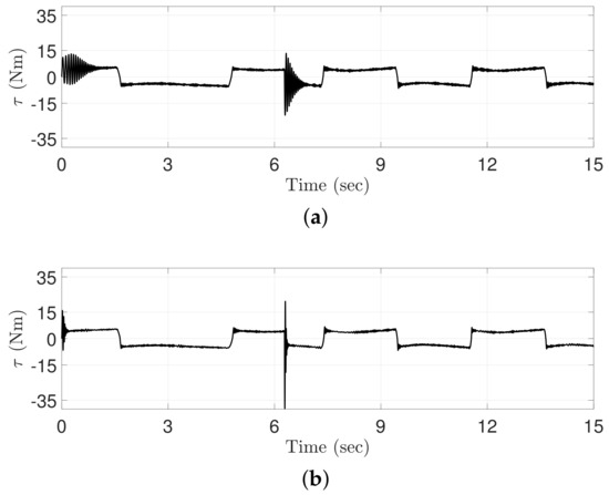 Figure 5 shows the control torques generated by the conventional ATDC and the proposed ATDC-SM. As shown in Figure 4, the control gain is directly related to the control torque. In fact, the conventional ATDC causes undesired side effects, such as chattering, because it employs the control gain with a discontinuous function. By contrast, the control gain of the proposed ATDC-SM is based on continuous functions, which does not cause undesired side effects such as chattering. However, the chattering generated in the transient region, as shown in Figure 5, is caused by the sensor noise term used in Equation (12) of the revised paper. In other words, the proposed ATDC-SM results in reducing undesired side effects such as chattering and producing a stable control torque compared with the conventional ATDC.