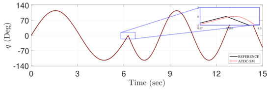 To determine the feasibility of the proposed ATDC-SM in multi-input–multi-output (MIMO) system, we have performed simulations through the system model of two-link robot manipulator. In this simulation, reference trajectories with non-differentiable point (Figure 9) was designed to be of both low and high frequencies. Two control approaches, i.e., the conventional ATDC [21] and the proposed ATDC-SM, have been applied to a two-link manipulator as an independent control method. Subsequently, all of their parameters are tuned in a low frequency trajectory.