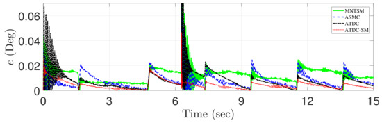 Figure 14 shows the tracking errors of four control approaches, i.e., MNTSMC [16], ASMC [18], the conventional ATDC [21], and the proposed ATDC-SM. As shown in Figure 2 and Figure 13, in reference trajectory between 0–7 s, the tracking errors of all control approaches in Figure 14 are also the same as those in Figure 7 because the reference trajectories of Figure 2 and Figure 13 are the same. However, the tracking errors shown in Figure 14 differ from those shown in Figure 7 around 7 s. As one of the differences, the tracking performance of the existing control approaches is significantly degraded in reference trajectory with non-differentiable point. They cause larger chattering and fluctuation around 7 s. On the other hand, the proposed ATDC-SM has good tracking performance without undesired side effects such as chattering. It implies that the proposed one shows better robust tracking performance than the existing control approaches. As another difference, since the reference trajectory provides large amplitude with high frequency in 7–15 s, the existing control approaches have slow convergence to the equilibrium point, and then the peak point for tracking errors is larger. On the other hand, the proposed ATDC-SM not only maintains fast convergence speed but also shows little change in peak point for tracking errors. RMS errors of all control approaches are shown in Table 2.