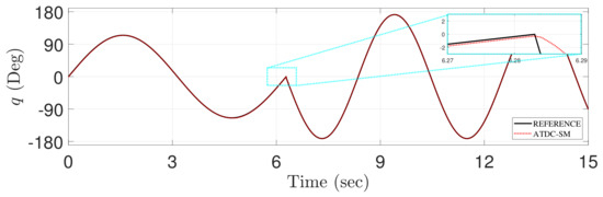 Figure 15 shows both tracking and reference trajectories generated by the proposed ATDC-SM. Since the reference trajectory (Figure 13) has large amplitude, its slope changes rapidly at appropriately 7 s. However, the proposed one provides fast convergence rate with less fluctuations and hence has a similar level compared with the reference trajectory in transient region.