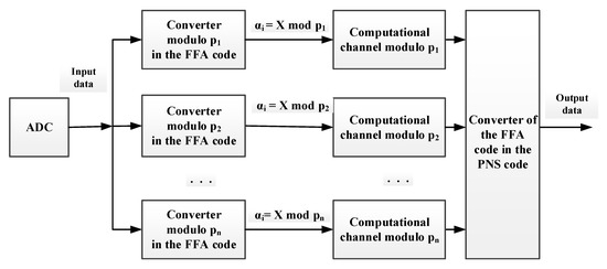 The known methods [18,19,20,21] for data conversion from the positional representation to the FFA code are based on the sequential bitwise conversion of the source number. To get the modulo residue the arithmetic operations with the number bits are conducted. The type and the number of arithmetic operations depend on the conversion method. It determines the number of operation cycles for the conversion device. Our study has shown that the data converter from positional representation to the FFA code can be excluded from the DF structure. In this case, the ADC can be used as a control device for the selection of the required residue from the memory device of the output sample. We described the structure of the computational channel and provided several practical tests, aimed both at a speed characteristics study and error estimation. The optimization technique was given and experimentally tested.