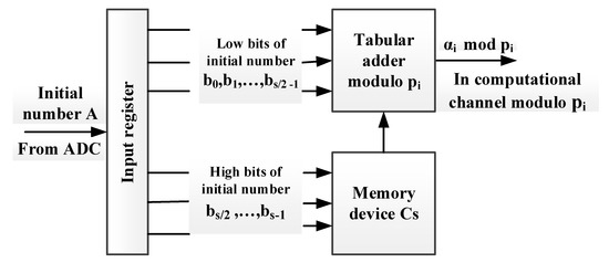 From the expression (15) it follows that the upper bits of number unambiguously determine the number of subrange in which the number is. While the lower bits of number A determines the index of number in the subrange. Thus, based on the cyclicity property of residues modulo, the finding of residue for the number A will include determination of subrange number and reading the residue from the memory device for each subrange. Considering the Equations (13)–(15), the algorithm of residue finding on the basis of subrange determination will include the following procedures: