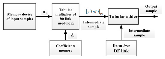 As soon as while building the digital receiver the range of data being processed in the digital signal processing device (Figure 3 and Figure 4) is known, namely, the bit width of used ADC is known, then there is an opportunity to represent input data being processed in the filters’ computational channel in the FFA codes without ADC and the device of their conversion. Considering Equation (12), the values of residues for any module of the selected base system do not exceed the value of the module and their count is equal to the module value. Then as a source of input data for the DF’s computational channel a memory device can be used. It records the values of residuals for the selected module.