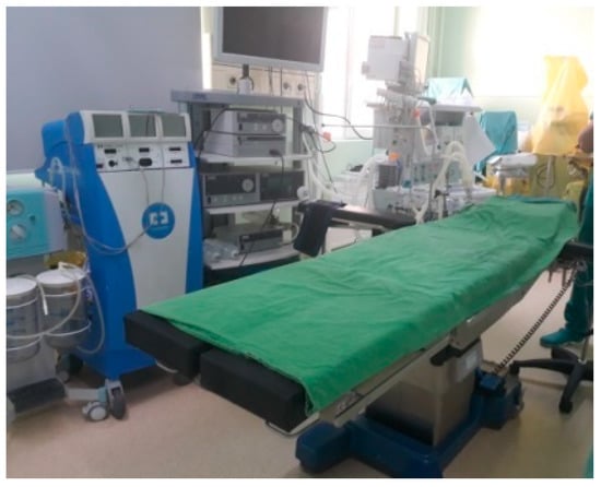 The procedure takes place in an operating room (Figure 2) where the necessary equipment is provided: an operating table adjustable on three axes, a vital signals monitoring system (respiration, cardiac rhythm), and anesthesiology equipment. On the lateral side the laparoscopic tower is positioned, and in its proximity, the ultrasound tower.
