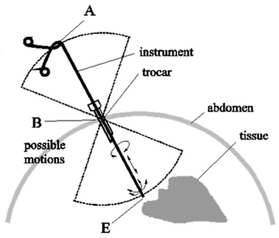 In 1995, Russell Taylor [] introduced the concept of the remote center of motion (RCM), defining it as the point of entrance in the abdominal cavity, a fixed point which should not be displaced during the medical task. In minimally invasive surgery (MIS), it is used for instrument insertion into the body, and for our procedure this concept is used for the manipulation of the I-US probe. Based on Figure 3, it can be stated that with respect to point B (RCM), the instrument can achieve four independent motions: