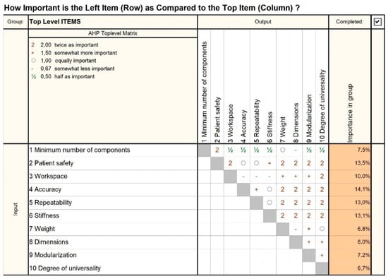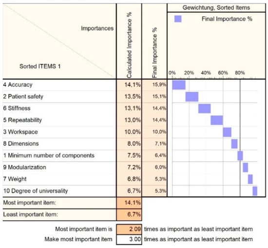 The medical protocol and the design constraints led to the definition of 10 critical technical characteristics of the robotic system which, through adequate implementation, should lead to a reliable technical solution minimizing the risks associated with the medical procedure. An analytical hierarchy process (AHP) analysis was performed to determine the relative importance and criticality of these characteristics with respect to the medical task and is presented in Figure 5.