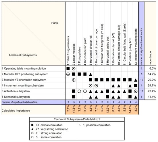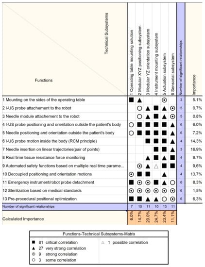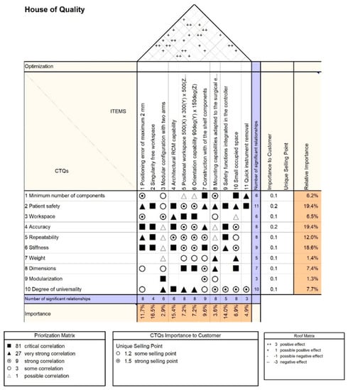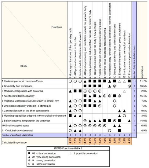 In a four-phase QFD, an importance analysis of the measurable quality characteristics, functions, technical subsystems, and individual robot components is performed along with the identification of the unique selling points of the proposed solution. The design methods were implemented using Qualica software []. Usually there are three scales for the numerical correlations among the analyzed parameters in the QFD (1, 3, 9). However, the authors chose an extended scale (1, 3, 9, 27, 81) to allow a better “resolution” of the analysis. Furthermore, the correlation number was chosen by clinicians and engineers based on their professional experience: for QFD-I, the clinicians attributed the correlation values based on the previously presented risk assessment (Table 1); for QFD-II, -III, and -IV, the engineers attributed correlation values by closely considering fundamental theoretical aspects (from mechanism science, such as kinematics and singularity analysis) and the predefined robotic assisted medical protocol (see Section 2.4).