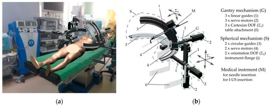 - The main components of each module have a total of 5 DOFs and are composed of two main mechanisms: one gantry mechanism with 3 Cartesian DOFs for the insertion point/RCM positioning (having three linear drives) and one spherical mechanism with 2 orientation DOFs for the needle trajectory or I-US probe manipulation (having two circular drives);